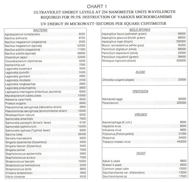 The effectiveness of the disinfection process is related in terms of ultraviolet system dosage. The total system dose is calculated by using three major parameters. First, the intensity of the ultraviolet lamp energy; second, the exposure time or flow rate through the contact chamber; and third, the ultraviolet transmission quality of the water. The total intensity the ultraviolet lamp emits is measured by microwatts at the specific ultraviolet wavelength. By combining the total lamp intensity and the time that the water is exposed to the light produces a measurement unit known as micro watt seconds per squared centimeter (uw-sec/cm2). It is important that when referring to dosage that it is at EOL (end of lamp life). The recommended minimum EOL dosage for ultraviolet equipment for use in the disinfection process of potable water is 16,000 uw-sec/cm2, as published by the Department Of Health, Education and Welfare. Today reputable ultraviolet manufacturers design equipment to produce a EOL dosage exceeding a minimum 30,000 uw-sec/cm2. Most bacteria, viruses and other microorganisms are readily destroyed with systems of this dosage design. Refer to chart #1 for specific requirements of destruction.