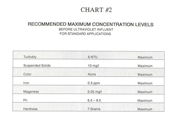 The application of a household water treatment system usually starts with a water quality concern from the homeowner. Once the consumer has become aware of a water quality situation, they want to produce the purest water possible with economic limits. If the quality problem is bacterial, applicable pretreatment equipment should be installed in front of the ultraviolet unit to improve the ultraviolet transmission characteristics of the water. Ultraviolet equipment should not be a stand alone system unless the overall water quality permits. It is necessary to reduce any Iron, Manganese, Sulfur, and turbidity to minimum levels. (Refer to Chart #2) These minimum requirements are neccessary as the transmission directly affects the dosage by regulating the intensity of the ultraviolet light as it passes through the water. If there is excessive turbidity beyond acceptable limits, it could possibly hide or shadow organisms that pass through the ultraviolet system, effecting overall system performance.