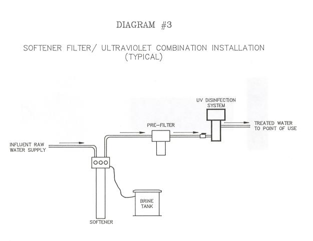 One of the most common water problems is hardness, which produces white-gray scale deposits in piping, water heaters, and whatever equipment the water comes in continual contact with. Water softeners are used to remove hardness (calcium and magnesium) and other minerals from the water supply. It is important this process be performed prior to ultraviolet influent levels. The water softener is applied as pretreatment to the ultraviolet equipment, see diagram #3 for typical water softener, filter and ultraviolet equipment combination. Without their removal, it is possible for the calcium and magnesium to plate out and coat the quartz sleeve. This build up on the quartz will limit the ultraviolet light's ability to transmit full intensity throughout the water. Where hardness is a problem, the use of a water softener will benefit the homeowner with higher quality water and will enhance the ultraviolet equipment's performance by allowing high ultraviolet light transmission, along with minimizing maintenance requirements for cleaning the quartz sleeve on a more frequent basis.