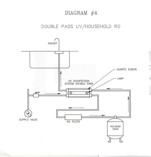 Point of use reverse osmosis (RO) equipment is capable of producing very high quality water at a slow rate. Because of the low water output, the water produced is stored in a holding tank. The combination of RO with ultraviolet equipment provides a complete system design where the equipment compliments each other while increasing performance. Ultraviolet equipment applied as pretreatment to a RO system assists in preventing premature bacteriological fouling and/or failure of the RO membrane. This pretreatment combination will result in a long term cost savings to the customer by extending the life of the RO membrane. Another application for ultraviolet is post treatment after the RO system prior to point of use for disinfection. Bacteria can breed in the RO membrane as well as grow through to contaminate the holding tank and potable water supply. The high quality water produced by the RO system will have excellent transmission characteristics and enhance the ultraviolet equipment performace. There are many designs of ultraviolet water disinfection equipment available. The optimum design to be combined with a RO system is the two pass ultraviolet equipment. One stream can be used for pretreatment to the RO system and the second stream after the RO and holding tank for point of use disinfection. (See diagram #4)