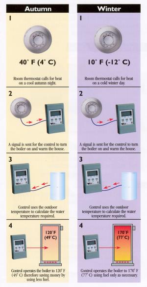Taco Outdoor Reset Controls Provide Intelligence to Your Heating System. With the information retrieved through an outdoor air sensor the control can match heat output closer to the needs of your home. The system adjusts even before you feel too cold or warm. How Much Will I Save? Outdoor reset controls are not a new concept. Most controls are installed in commercial applications such as office buildings, apartment houses and churches. Taco has now made those controls available at affordable prices to the homeowner. Savings will vary depending on many factors, but a recent energy study performed by the Environment and Energy Resource Center in St. Paul, Minnesota showed that outdoor reset controls saved an average of 14%. Typical payback is under three years. Frequently Asked Questions. Q: Can I still use the same control if I replace the boiler or fuel source in the future? A: Yes, Taco controls work with a variety of heat sources. Q: Will I need to call the installer every time I want to change the settings? A: No, you can change the settings. |
