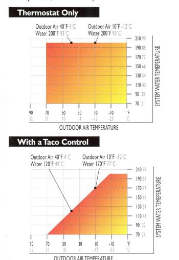 Without a Taco Outdoor Reset Control, your heating system does not know if it is a cool autumn night or the coldest winter day. Therefore it works as if it's always the coldest day of the year and heats the water to a maximum temperature. By adding a Taco Outdoor Reset Control that works alongside your boiler and thermostat, you may see energy savings of up to 30%. The lower the heating system water temperature, the more fuel you save.